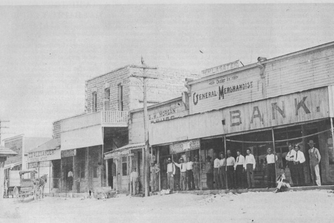 Along the former, Bowlen’s offered rooms, haircuts, and buggies for hire. The proprietor of Overmier’s General Store sold dippers of his well water to train passengers. Newt Markum built a drugstore, and on the first floor of his building, J.J. Sears sold axle grease, bacon, and coffins; upstairs served as a Masonic Hall. Sears owned the bank on the east end of North Front Street, a lumberyard, and farms around town. When occasion demanded, he served as undertaker.
